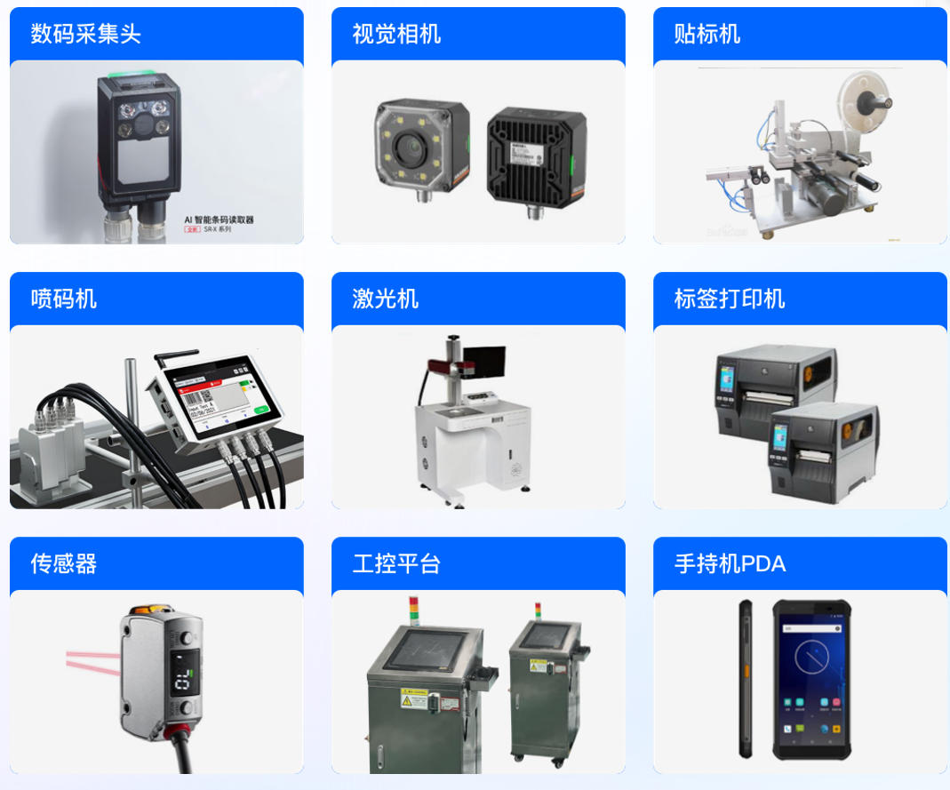 - 赋码设备:喷码机、激光机、标签打印机,满足不同材质、不同速度的赋码需求。