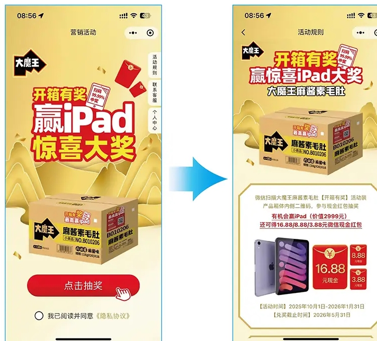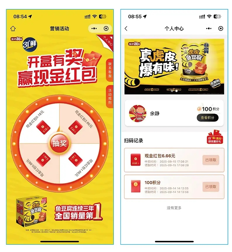 盐津铺子以 “箱码 / 盒码红包” 激活渠道推力,HiMarking 则在此类模式上形成标准化解决方案:营销费用以红包、积分形式直接触达消费者或终端店主,避免中间环节克扣;同时实时统计扫码率、核销率、参与人数等数据,让营销 ROI 清晰可量化。