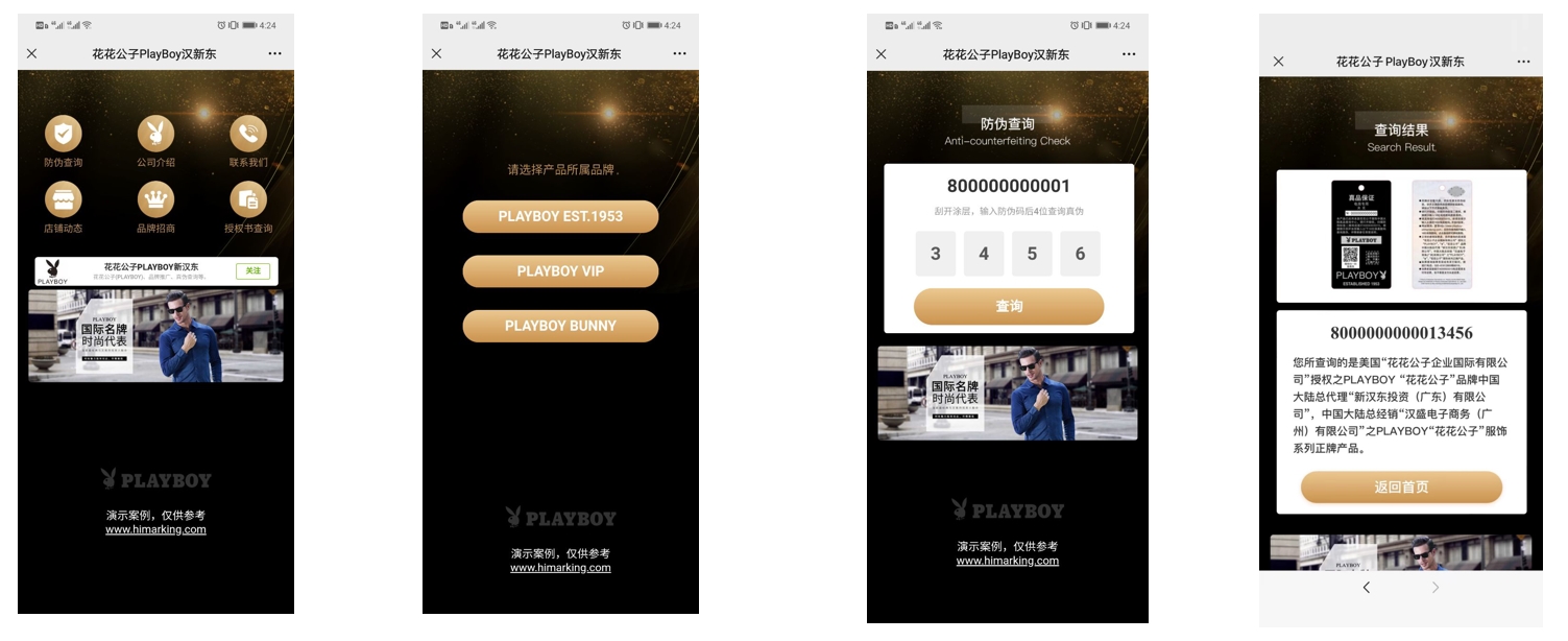 众多知名品牌通过HiMarking方案实现数字化转型。例如,PLAYBOY服饰项目通过一物一码防伪与吊牌一体化融合,实现线上线下产品授权管控,消费者可快速辨别真伪。多重防伪技术结合,有效提升品牌形象和市场秩序。