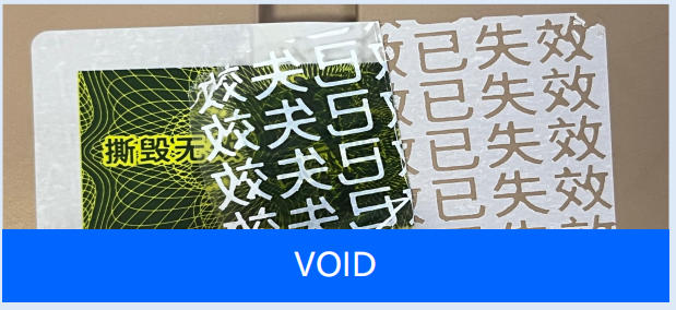 - VOID防伪技术:标签被揭开时,会留下“VOID”字样或定制图文,无法复原,杜绝重复使用。