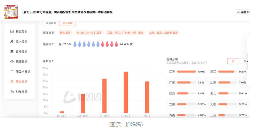 还有部分新锐品牌凭借差异化成分与渠道创新玩法脱颖而出。2025年,黄芪霜品类迎来爆发,某品牌在抖音平台的黄芪霜产品近半年销售额预计达到2500-5000万元,成交用户中41岁以上占比超过50%。