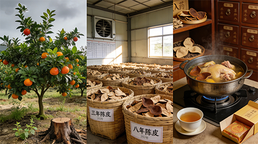 而真正的好陈皮之所以价格不菲,核心在于三点:一是道地产区稀缺,仅广东新会核心产区的茶枝柑皮品质最佳,且种植面积逐年缩减;二是陈化成本高昂,需自然存放 3 年以上才能称 “陈皮”,年份越久价值越高,期间要承担资金占用、仓储管理及霉变损耗风险;三是药食同源的高价值,陈化过程中有益成分富集,兼具养生、药用与收藏属性,既能入药调理脾胃、燥湿化痰,又能用于煲汤、泡茶、烹饪提香。