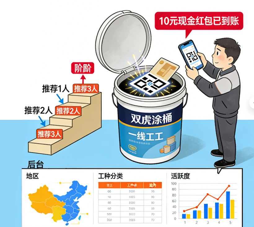 赋码策略:在涂料桶盖内侧嵌入隐形二维码卡片,需开盖施工时刮开涂层扫码,确保激励精准触达使用者。