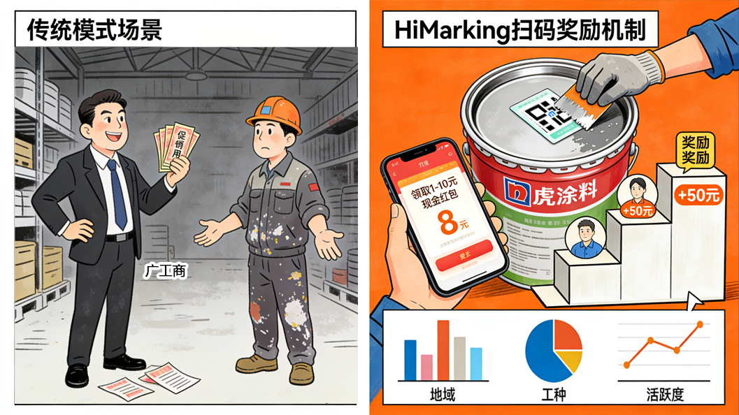 传统模式下,企业投放的促销费用往往被经销商层层克扣,一线工人难以获益。HiMarking为双虎涂料设计的“扫码奖励机制”彻底改变这一局面: