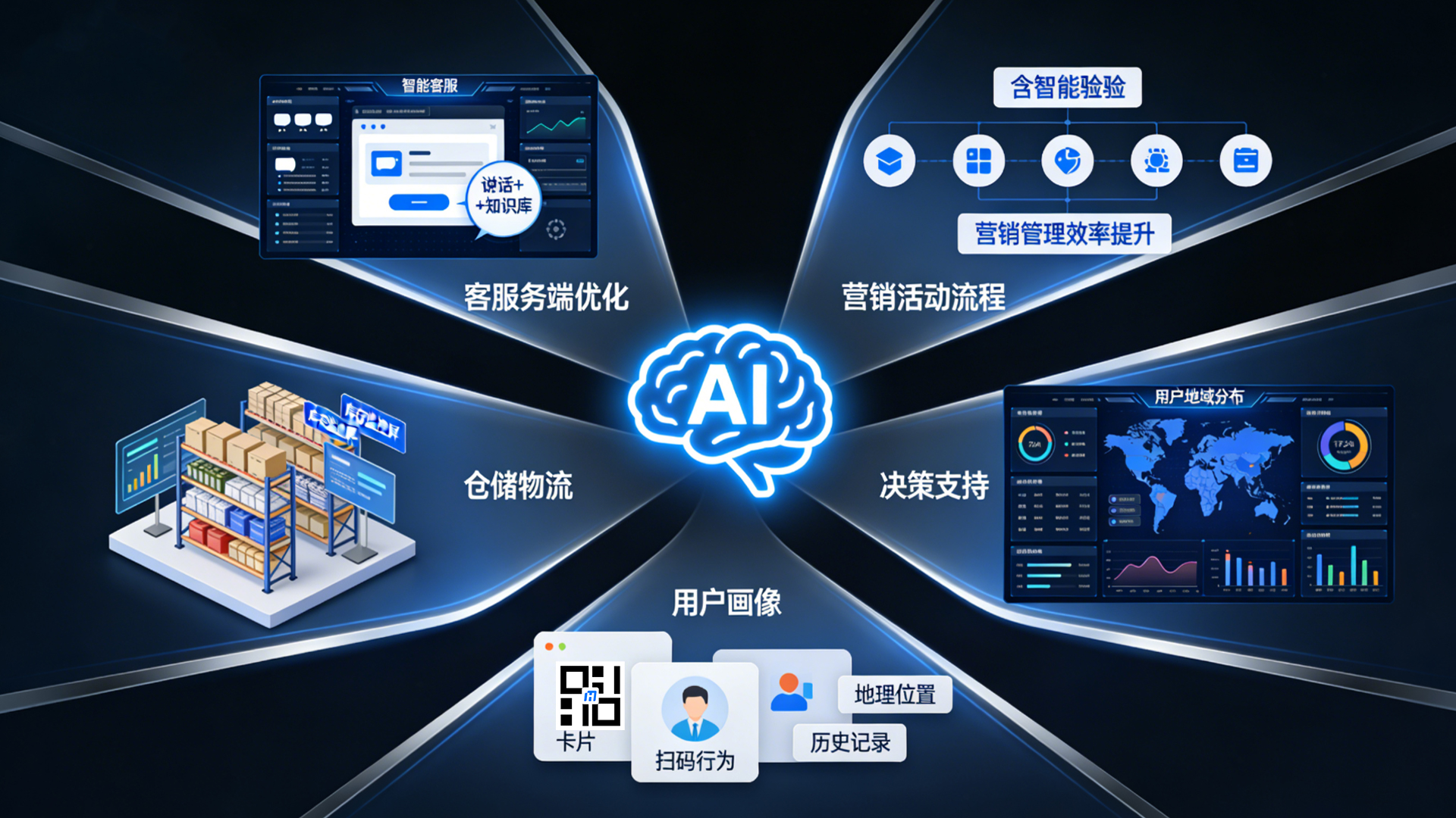 AI数智化赋能通过多维度技术手段全面优化企业运营各环节,具体表现为:在客户服务端,AI智能客服搭配私有化部署知识库,可高效解答消费者咨询;在营销活动管理方面,AI智能核验通过智能分析活动配置规则,大幅提升落地效率并避免人为出错;在决策支持层面,智能可视化报告结合多维度数据分析,精准呈现用户地域分布、行为偏好等画像,为企业生产调整与营销策略优化提供坚实数据支撑;在供应链管理上,仓储物流系统实现精准高效运作,通过实时监控库存、预警效期及先进先出管理,有效降低错发率与库存成本;在用户运营维度,智能用户关怀则结合用户扫码行为、地理位置、历史记录等数据,实现千人千面的精准营销活动推荐,最终形成从服务响应到策略优化、从供应链管理到用户深度运营的全链路数智化升级闭环。