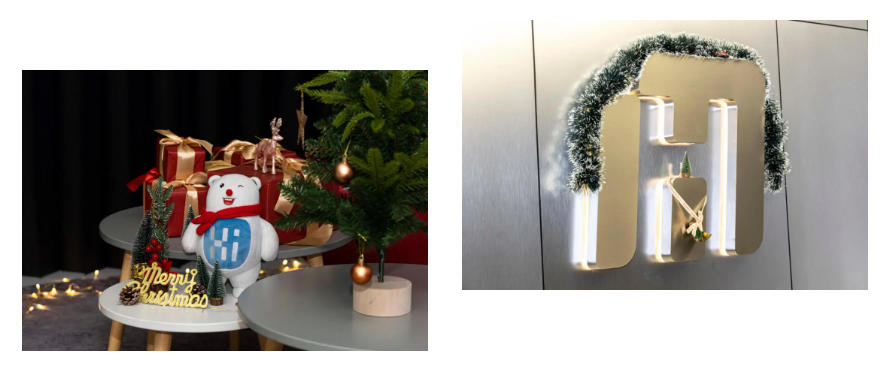 现场早已被圣诞巧思铺满:憨态可掬的熊宝吉祥物裹着红围巾、倚着鎏金礼盒摆件,圣诞彩灯与松果装饰错落点缀;装点一新的公司 LOGO 墙前,金属质感的标识被圣诞花环与迷你圣诞树环绕,暖光勾勒出温馨氛围。
