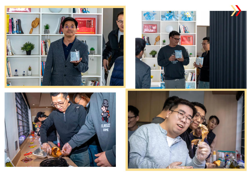 游戏落幕,温馨时刻如约而至。周年庆员工纷纷走到拼好的积木作品前,或并肩合影、或比出胜利手势,镜头定格下他们与公司共同成长的珍贵瞬间。最受期待的烤鸡宴环节登场,8 位幸运赢家率先戴起手套,鲜嫩的鸡肉香气四溢,复刻美国圣诞家庭聚会的团圆仪式。大家围坐一桌,分享着鸡腿的美味,畅谈着一年的收获与对 2026 的期许,欢声笑语中满是团队的温情与凝聚力。
