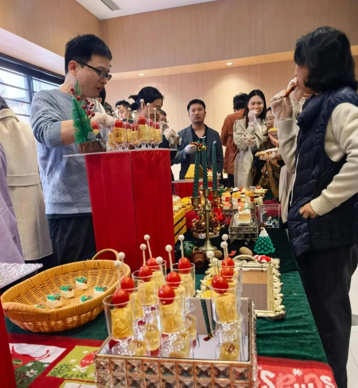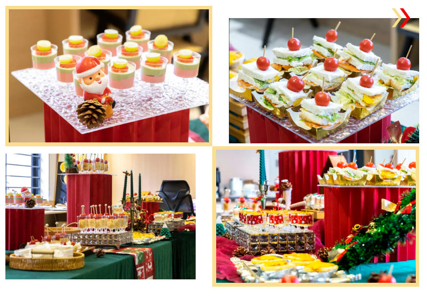 最后,全体员工移步精心布置的下午茶区,这里的装点更是将仪式感拉满:金箔餐盒盛装的精致三明治顶缀鲜红樱桃,分层慕斯杯以粉绿撞色呼应圣诞氛围,搭配俏皮的圣诞老人摆件与松果装饰,每一处摆盘都藏着筹备团队的巧思;暖香的热饮氤氲着热气,与现场的圣诞彩灯、熊宝主题装饰相映成趣。大家边品尝这份用心筹备的美味,边轻松畅谈,在惬意氛围中为本次双庆活动画上圆满句点。