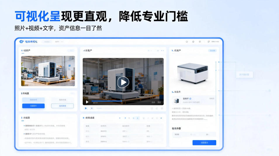 资产信息呈现复杂、专业门槛高,是很多同类产品的共性问题 —— 大量文字堆砌的条目的,让非专业人员难以快速理解资产状态。HiMarking 方案采用 “照片 + 视频 + 文字” 的多维呈现方式,将资产信息直观化、通俗化,无论是资产外观、使用场景还是核心参数,都能一目了然,降低了资产管理的专业门槛,让各部门员工都能轻松参与到资产管控中。