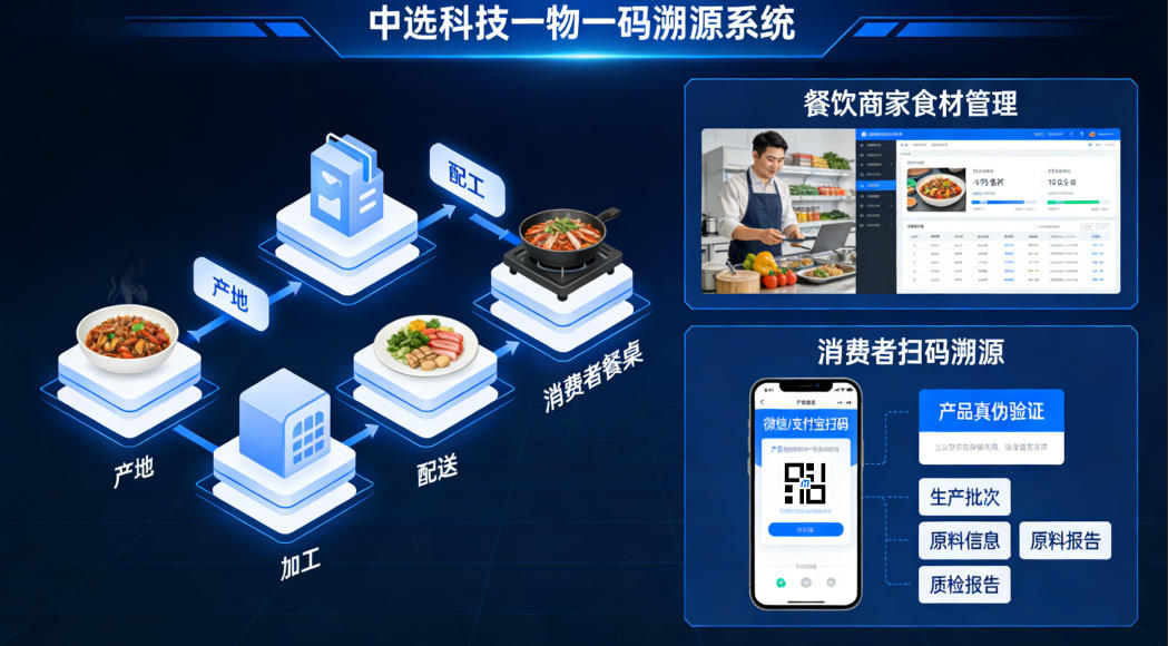 中选科技的一物一码溯源系统可以覆盖外卖食材从产地到消费者餐桌的每一个环节。在实际应用中,这套系统能够帮助餐饮商家实现全方位的食材管理。