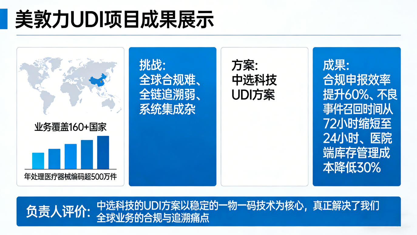 项目落地后,美敦力全球产品合规申报效率提升 60%,不良事件召回时间从 72 小时缩短至 24 小时,医院端库存管理成本降低 30%。美敦力全球供应链负责人评价:“中选科技的 UDI 方案以稳定的一物一码技术为核心,真正解决了我们全球业务的合规与追溯痛点。”