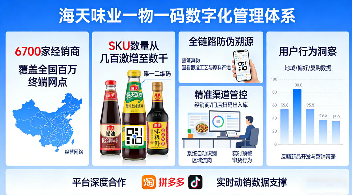 据行业观察,海天近年与拼多多、抖音等平台的深度合作,背后正依赖一物一码提供的实时动销数据支撑——让“系统能力”真正成为护城河。