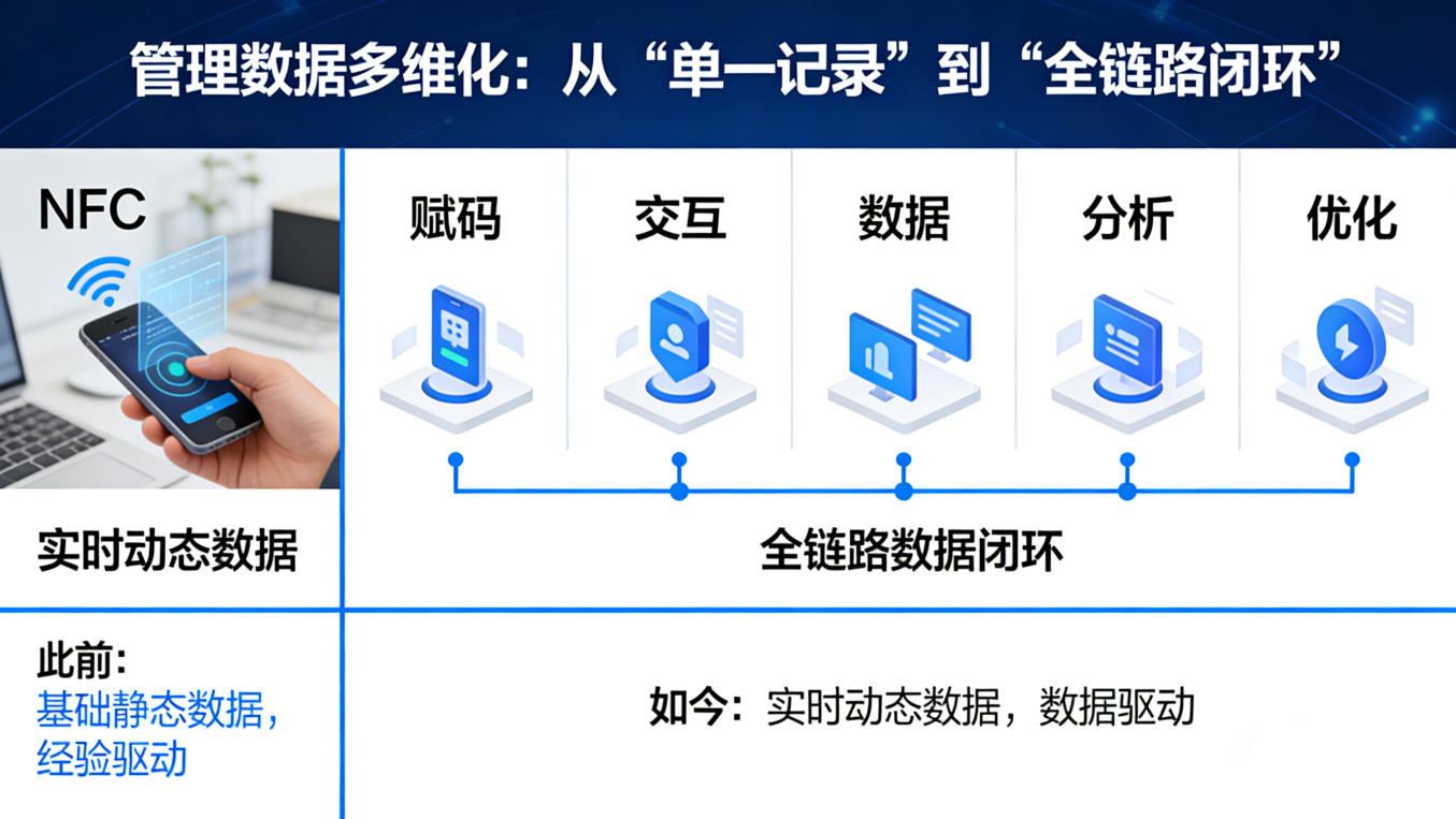 此前,NFC在资产管理中的数据价值被严重低估,仅能沉淀生产、仓储等基础静态数据;如今,每一次“碰一碰”都将生成一条实时动态数据——包括触碰的地理位置、时间戳、用户设备类型、交互深度(如查看信息、提交反馈、发起报修等),这些数据将资产的物理流动轨迹、使用场景、交互行为,完整地映射到数字世界,形成“赋码-交互-数据-分析-优化”的全链路数据闭环,让资产管理从“经验驱动”转向“数据驱动”。
