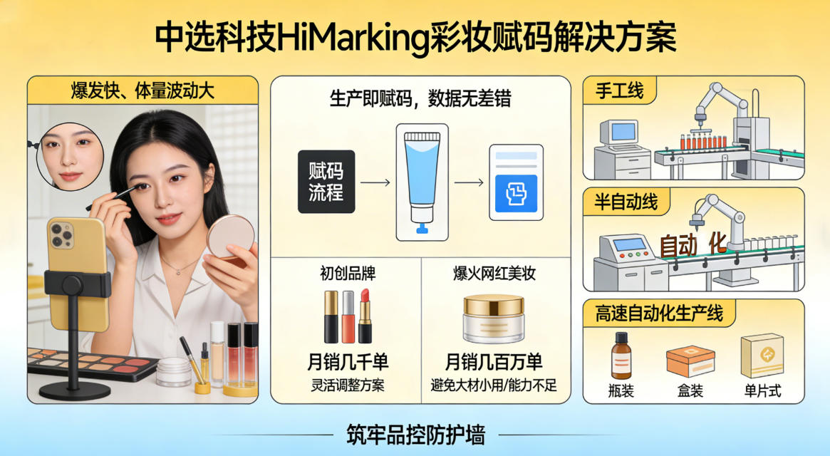 针对直播彩妆 “爆发快、体量波动大” 的特点,中选科技 HiMarking 无需品牌投入巨额成本改造产线,可快速适配手工线、半自动线到高速自动化生产线的各类场景,支持瓶装、盒装、单片式等不同彩妆包装的赋码需求,实现 “生产即赋码,数据无差错”。无论是月销几千单的初创品牌,还是月销几百万单的爆火网红彩妆,都能根据体量灵活调整方案,避免 “大材小用” 或 “能力不足” 的问题,让品牌在爆红之初就能快速筑牢品控防护墙。