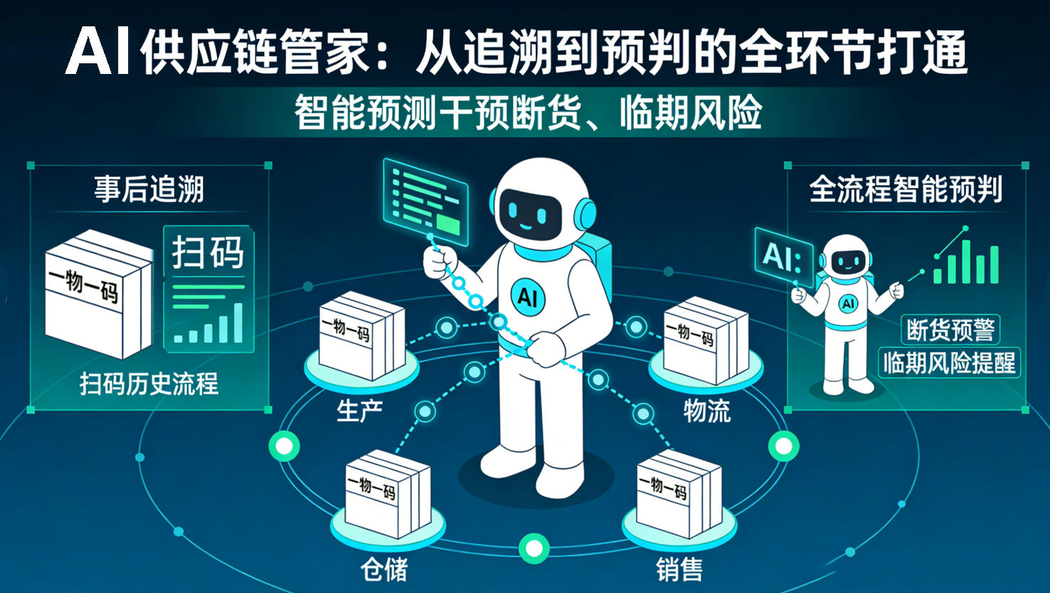 AI 供应链管家与一物一码深度融合,打通生产赋码、仓储管理、物流运输全环节,基于实时数据流对断货、临期、物流异常等风险进行预测性干预,精准完成账实核验、异常预警。让供应链从 “被动补救” 转向 “主动预判”,为终端访销提供稳定货品支撑,大幅降低渠道库存成本,提升补货精准度。