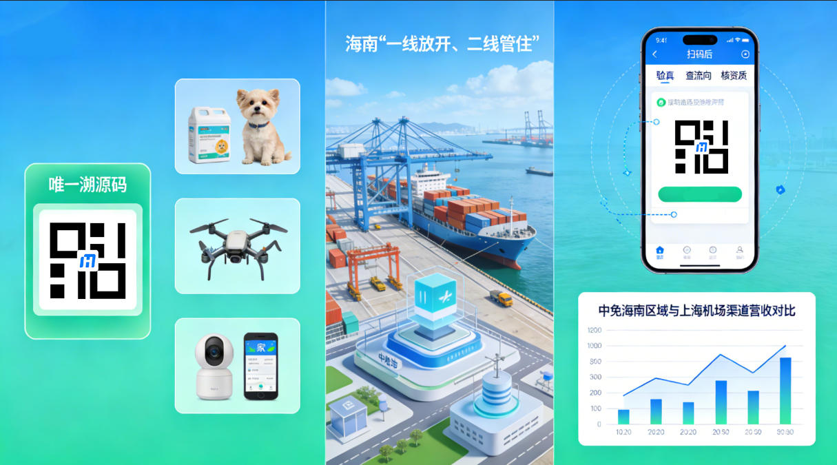 2025 年 10 月离岛免税政策扩至 47 大类,新增宠物用品、微型无人机、小家电等品类;12 月 18 日封关后,海南实行 “一线放开、二线管住”,免税品必须加贴唯一溯源码,具备防撕毁、留痕溯源功能,扫码可验真、查流向、核资质,成为监管、商家、消费者三方的 “信任凭证”。中免财报印证,海南区域收入仅微降 1%,而上海机场渠道大跌 25%,合规能力直接决定渠道存活率。