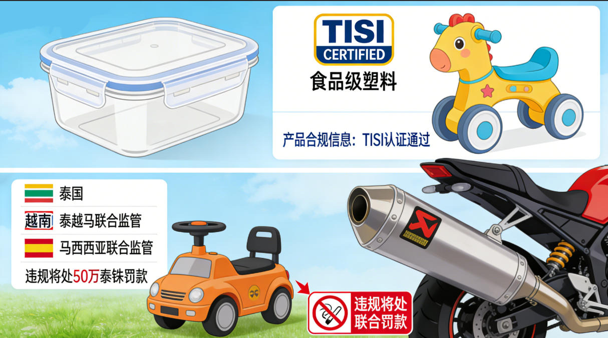 泰国正强化跨境电商合规认证,高风险品类(食品级塑料容器、儿童玩具、摩托车排气管等)必须通过 TISI 认证,同时要求: