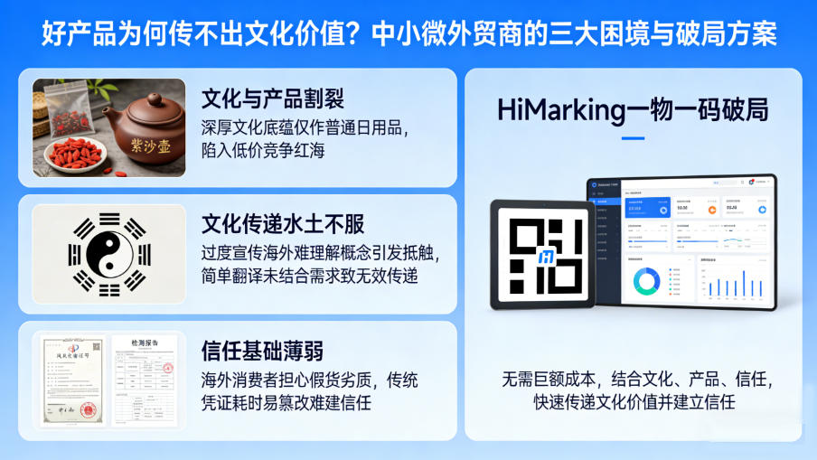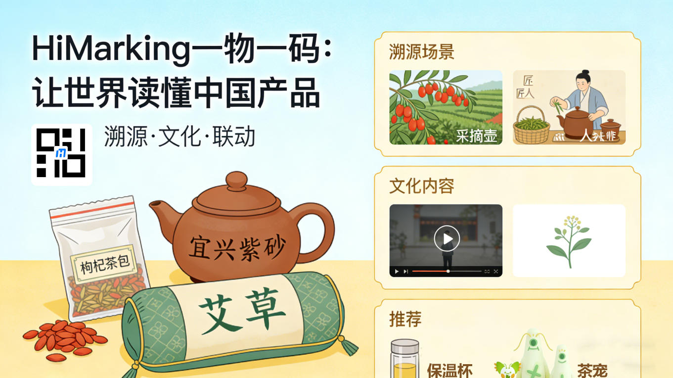 但现实是,多数外贸商仍陷入“只会卖货,不会传文化”的困境:明明手里握着有千年历史的茶具、药食同源的养生品,却只能在海外市场贴个“Made in China”的标签,把文化价值白白浪费;要么盲目跟风“国风营销”,堆砌玄学概念,反而让海外消费者产生抵触。其实,破解这一困境的关键,不在于投入巨额营销费用,而在于找到一个“轻量、高效、可落地”的载体——HiMarking一物一码,就能成为外贸商连接产品与文化、打动海外消费者的核心桥梁。