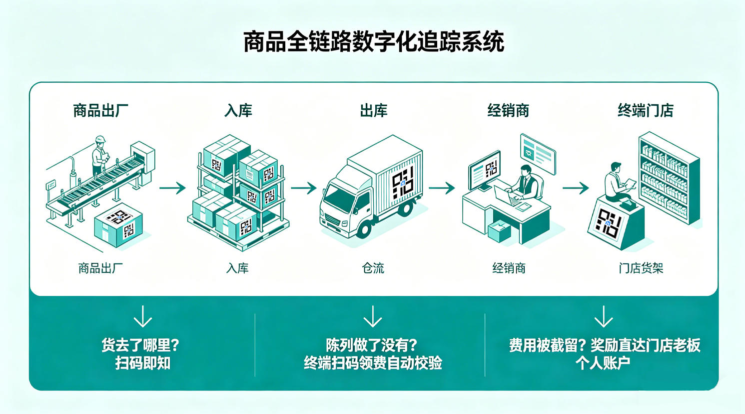 给每一件商品赋予一个唯一的数字身份,从出厂、入库、出库、到经销商、到终端门店,全程扫码记录。品牌方不用再问“货去了哪里”——扫码即知;不用再猜“陈列做了没有”——终端扫码领费,自动校验;不用再担心“费用被截留”——奖励直接发到门店老板的个人账户,中间环节零接触。